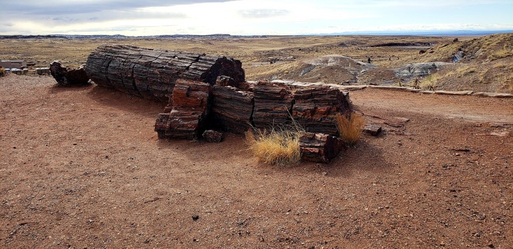 Anyway, now for the park! So we came in from the south entrance and made our way north to the Painted Desert entrance. The park road is not a loop so you will start at one end and leave the other. Coming in from the south was 0 traffic and 0 cars coming in. Granted this was a Sunday and the weather was SUPER windy, overcast, and not warm at all. In fact, the weather was pretty miserable! At least it wasn’t raining or snowing! After a brief stop in the visitor center (the apology letter on display from a child returning a stolen piece of petrified wood is great!) we did the mile or so loop through the petrified logs behind the visitor center called the Giant Logs Trail. Afterward, we did some short hikes, including the Agate House Trail, which was the longest we did, probably 2 miles out and back to a reconstruction of an old native house made of the petrified logs. A note about this one, is that it is right at the end of the visitor center parking lot and we missed it driving by and had to double back later on! Heads up! The other hikes we did were also short and really…once you’ve seen some petrified logs, I think you have kinda seen them all!? I will say the landscape, while particularly pretty, sure seemed unique and very alien to me. One spot that might have been a good pretty hike was the Blue Mesa Trail, but even that one is very short coming in at like a mile. The drive up to where that trailhead was was the only spot of elevation during the drive, not much, but it did afford some get views over the landscape. We did not do the hike. The weather was just too meh.