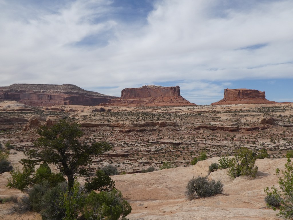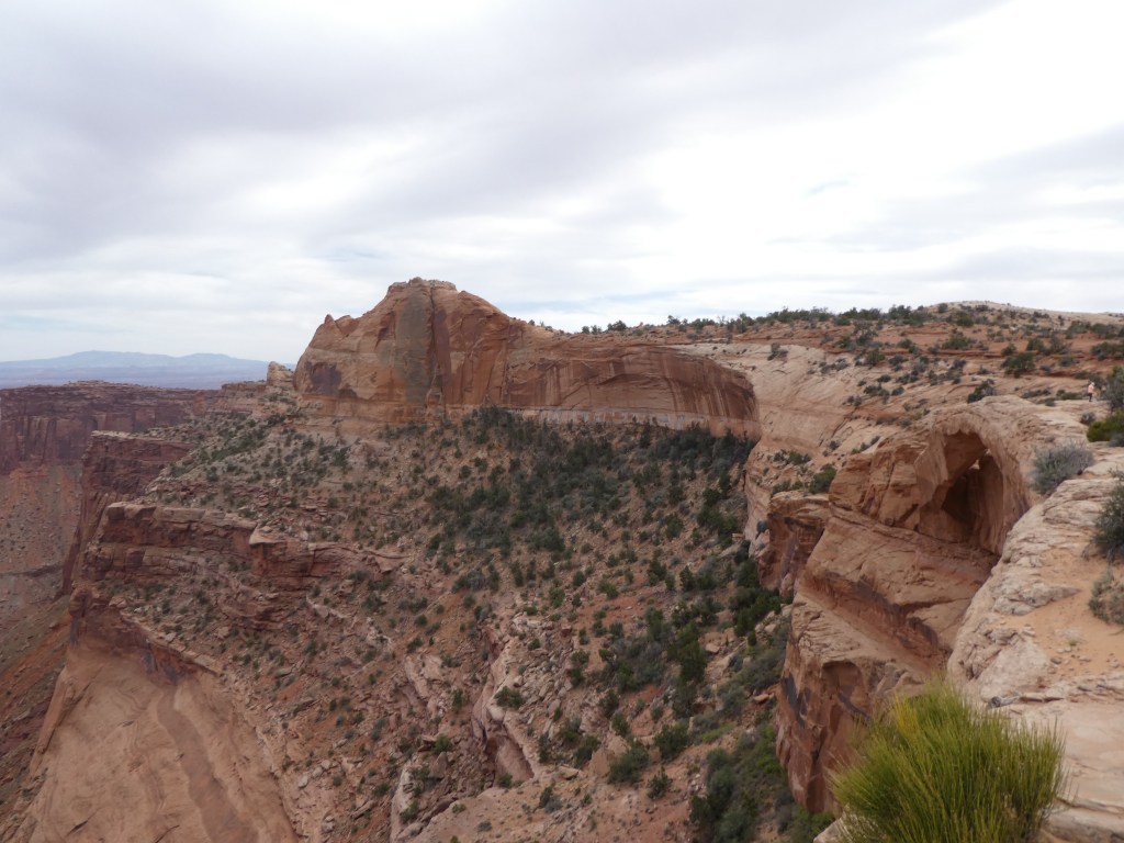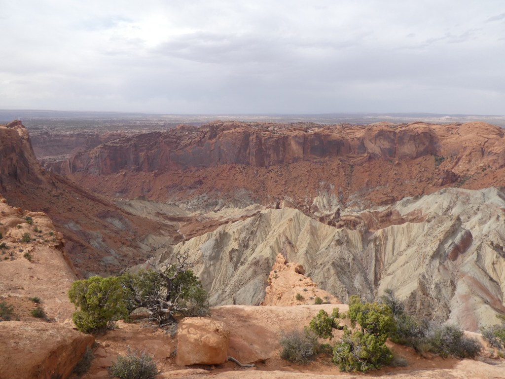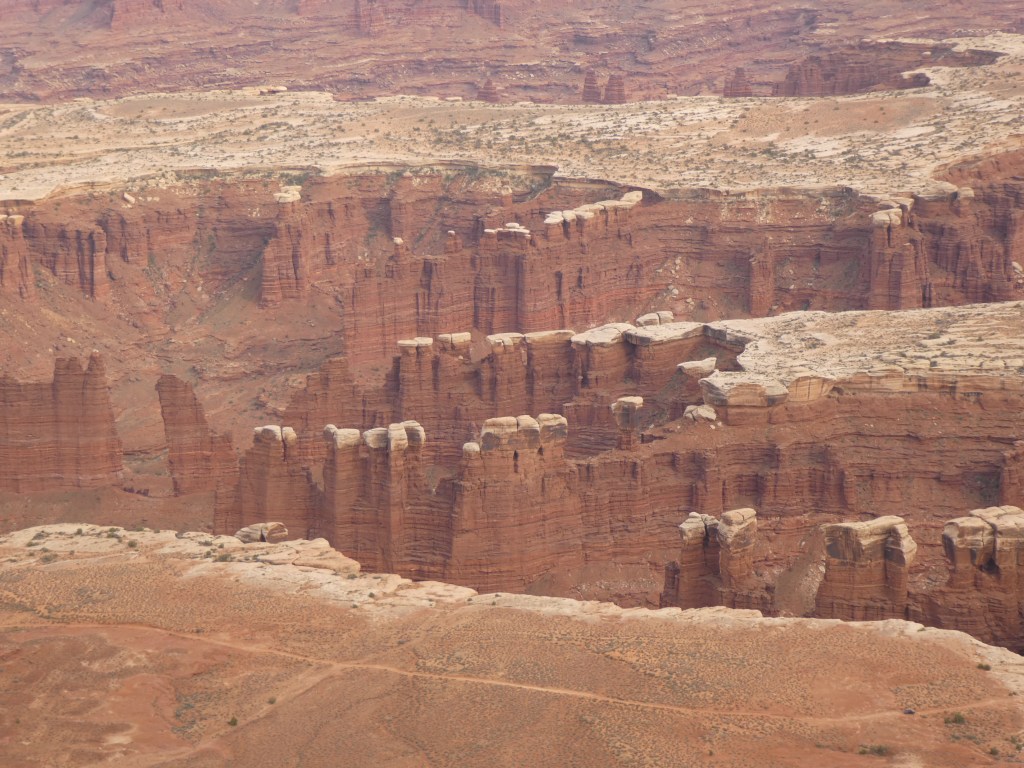 The Merrimack and Monitor are not actually within the boundaries of the national park; it was still many miles from that spot, passing grassland (???) and herds of cattle grazing in the open fields. Though there were signs warning of wait times, the entrance to the park was wide open and after snapping the entrance picture, in I went to National Park 28! After a quick stop at the visitor center I walked across the street to get some spectacular views of the cliffs of the Island of the Sky mesa and the “White Rim,” 1000 feet below stretching as far as the eye could see, and then even further down, another 1000 feet to the canyons that the rivers have carved out. I was very surprised at the expanse of the area leading off to the distant La Sal Mountains. The only sign of civilization was the well known Shafer Road snaking through the cliffs below my vantage point.