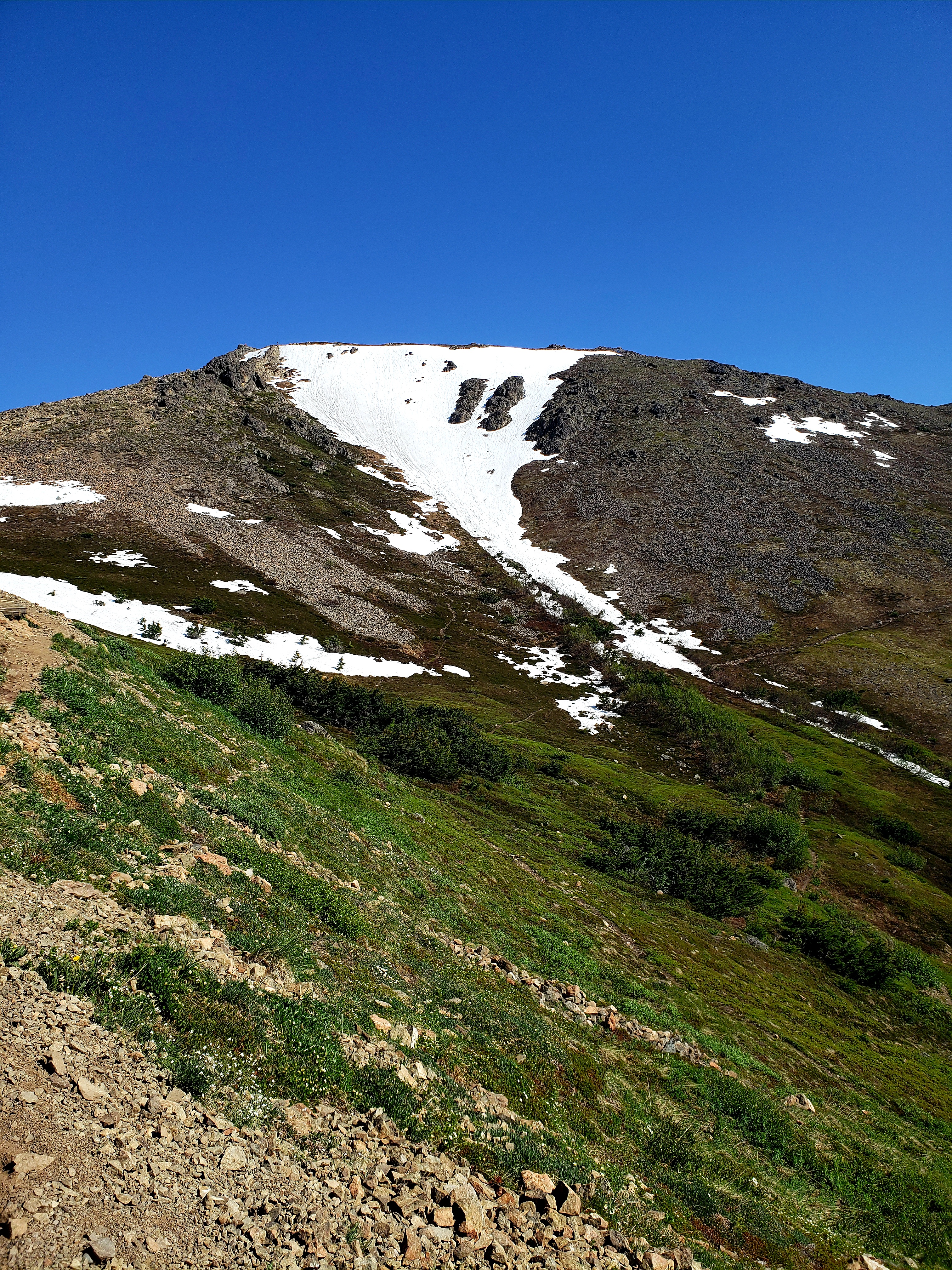 Afterward, I did some recon for my upcoming fall trip! The Sidekick and I will be visiting the Fairbanks and Denali areas in September and we have discussed driving Hatcher Pass. We would be coming from the other side, but I wanted to scope out the road from the Palmer end. This is a super cool drive. It runs next to the little Susitna River and it was raging! This road is known for it’s amazing views, and an old abandoned mine that is now a state historical park that is very popular. As the road ascended there were plenty of pullouts to see some great vistas down the valley! Eventually you come to the end of this part of the road, which leads to some lodges and that old gold mine. From here you can make a turn and head up the unpaved part of the road through the pass. For my visit, this part of the road was under feet of snow and closed! Again, bear in mind the unusual mix (at least to me) of 70 plus degree weather and feet of snow blocking a road!