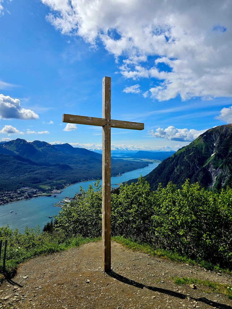 Saturday was the first of three absolutely stunning days! We planned to explore the Mendenhall Glacier, the real Juneau showstopper, and planned accordingly to spend half of the trip in lodging nearby, so this was the day to change locations. The glacier was neat to view, but it has retreated so much that the best view is from the visitor center viewing platform. To access the glacier you need to kayak, as trails only take you to other viewpoints. There is however, one cool feature to hike to: Nugget Falls. This waterfall is pretty impressive! It only exists because of the glacier’s retreat and is found at the end of a pretty easy, mile or so hike. If you want to see the area without a huge crowd, get there early to beat the cruise ship crowd! After adventuring around the we headed back downtown to check out another must do in Juneau: Deckhand Dave’s Fish Taco food truck. Legit, this is a must do in the area! The Sidekick is vegetarian, so while the place is called a ‘fish taco” joint, this is actually a food truck/bar “area” with several options that suited her, while I got shrimp tacos that had been harvested that morning from Skagway! When I say get there at opening at 11 AM, you should! We were there a bit early and still had to wait in line. At 11 the line for the fish taco truck was about 20 deep! Next up was the bigger more strenuous hike: Mt. Roberts. This trail is actually a continuation of the Gold Creek Flume trail we hiked earlier in the trip. This trail leads up the mountain that overlooks the Gastineau Channel above Juneau. There is an aerial tram that also leads up to the mountain from the cruise ship terminal. It is quite pricey at 50 dollars up, but if you hike up, and tram down it’s 10 bucks, or FREE if you spend money at the restaurant/bar/gift shop at the top. Most people do that, and so we did as well. After reaching the tram station, the Sidekick decided to chill at the restaurant and I continued about another half mile or so up the trail to a beautiful scenic spot called Nolan’s cross. This spot is gorgeous in every way! Definitely a highlight for the entire trip! The trail actually goes on for many more miles but this was my ultimate destination, so I met up with the Sidekick and we called it a day to prepare for an early morning.