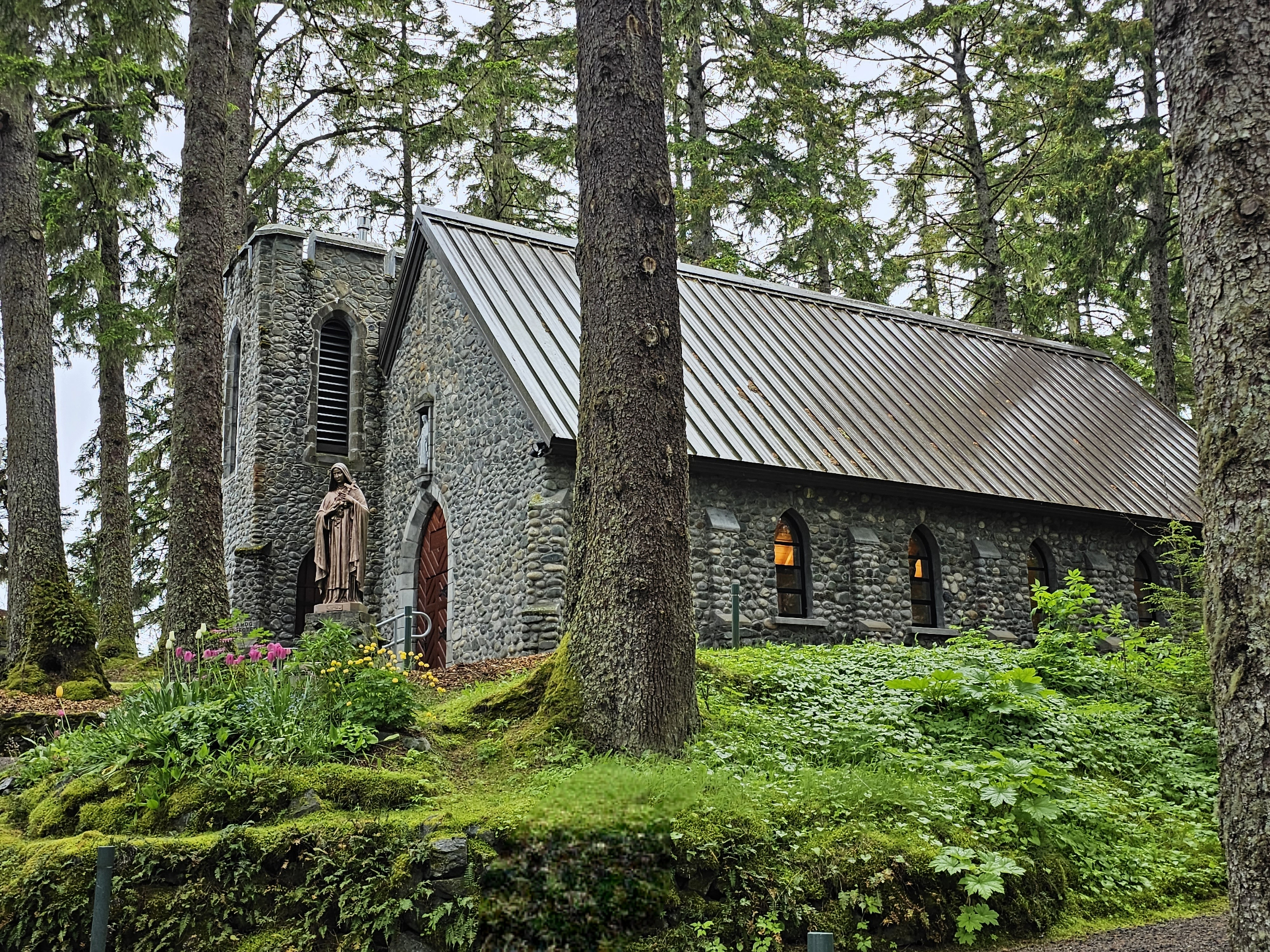 Thursday saw us begin the day by visiting the Sandy Beach in Douglas. Here we walked on an actual …well…Sandy Beach! There was some kind of structure sitting up high out of the water (it was low tide) and a bald eagle was chilling on top with the mountain serving the perfect backdrop. It was a great peaceful spot to take in the surrounding scenery. From there we headed into Juneau and did some more exploring! Juneau has a cruise ship port so we checked that out: pretty much what you would expect with shops and restaurants for the cruise passengers. We stopped at a couple breweries: Alaskan Brewing Company and Forbidden Peak Brewery. FYI, there are weird alcohol laws in Alaska. A brewery can only serve what they make, and only like 32 ounces to anyone in any one day, yet you can go to the bar down the road and drink as much as you want. They also have to close at 8, and there is some weird rule against games and music in a brewery as well. Really bizarre! Alaskan Brewing Company is located in an industrial type spot in the midtown area, although they do have a tap room near the cruise terminal. They had the better beer, and you can actually find their beer in a lot of the lower 48. Forbidden Peak is in the Mendenhall Valley, and has a nice covered outdoor area with fires, overlooking Auke Bay, so the scenery was much better. We departed from there and drove the road north about 15 miles to a quaint church called The Shrine to St. Therese. It’s a particularly well known photogenic spot, but at this point it was raining and starting to get cold so the visit was brief and we headed back to downtown. A very enjoyable place to hang down by the cruise ships is a place called the Hangar. The bar here overlooks the marina and you have a huge cruise ship staring down at you, but the sea planes depart from right below the Hangar…hence the name! The Hangar had some pretty banging fried mushroom “fries” with sweet chili sauce…I highly recommend! We did some additional recon for activities later in the trip and stopped for dinner at a delicious Indian place called Spice, and by “nightfall” we found ourselves at another old school saloon type tavern called The Crystal Saloon. There is also a stage there and it was open mic night, so good entertainment was had!