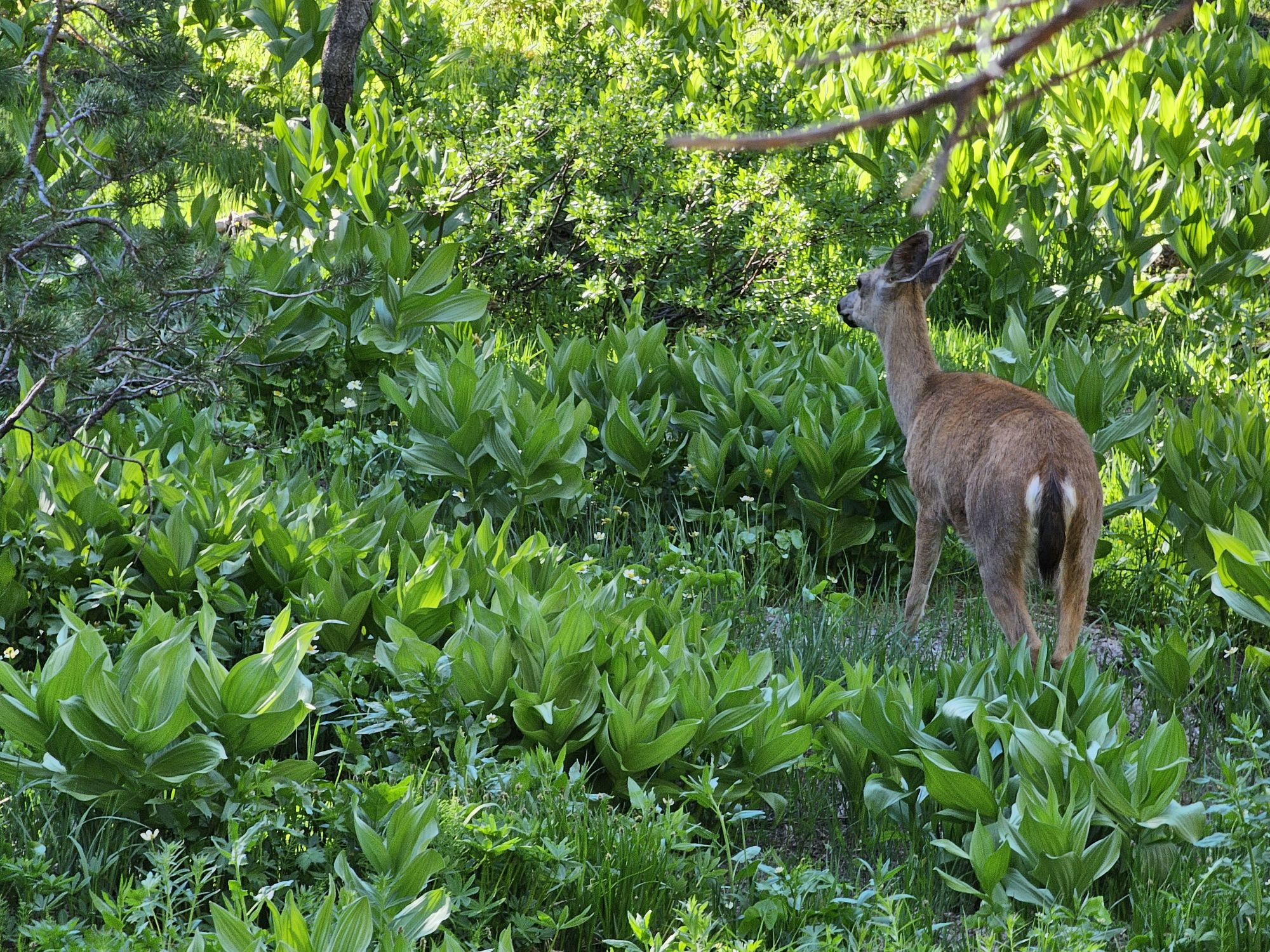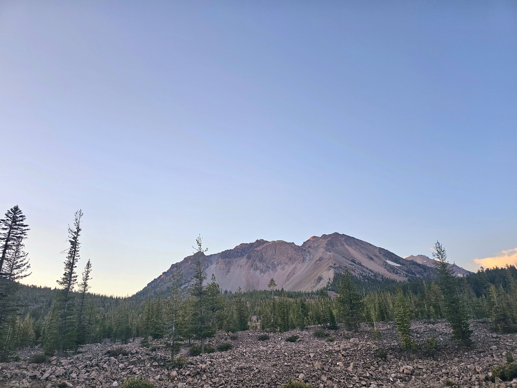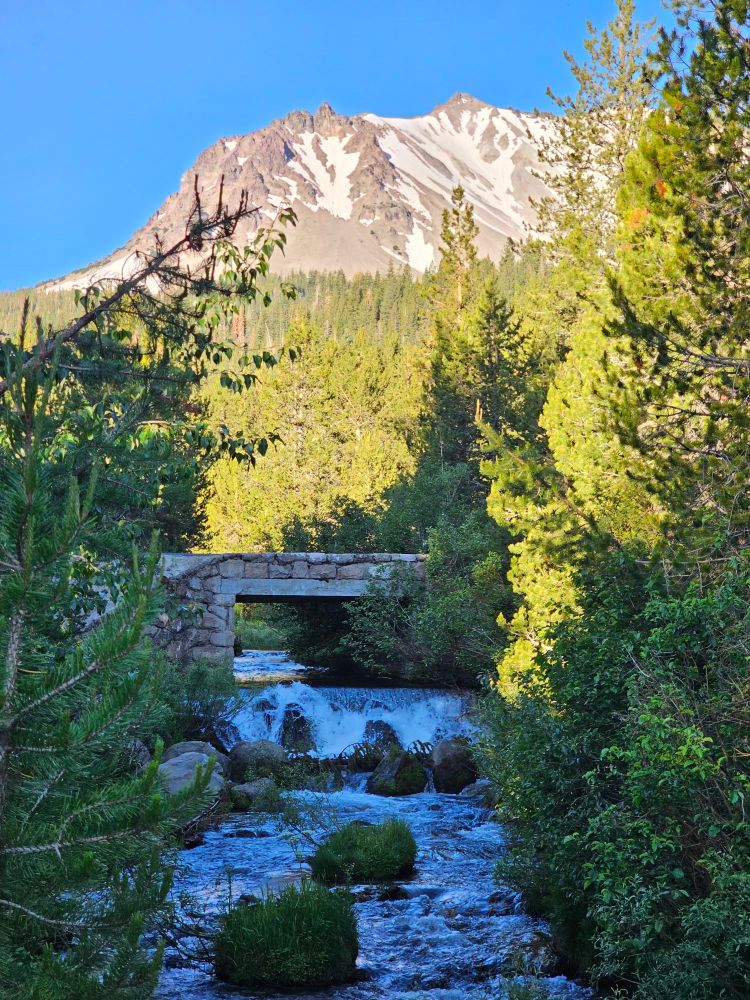For those keeping score at home, at this point I had done about 7.5 miles of unfinished hiking this day and I was hellbent on finishing a trail, so I took that couple’s advice and found the trail they suggested: Hat Lake to Paradise Meadow. This one started near a bridge, and you can get a really nice view of Lassen Peak framed by the bridge from here (a sketchy descent down a steep hill to a stream below is required). This trail is about 3 miles round trip, with 600 feet of gain. I saw one family and that was it. The entire trail follows the stream uphill, eventually ending at a pretty meadow. There are some small waterfalls along the way and some deer were hanging very near me during parts of the hike. It was definitely a nice way to end a tiring day!