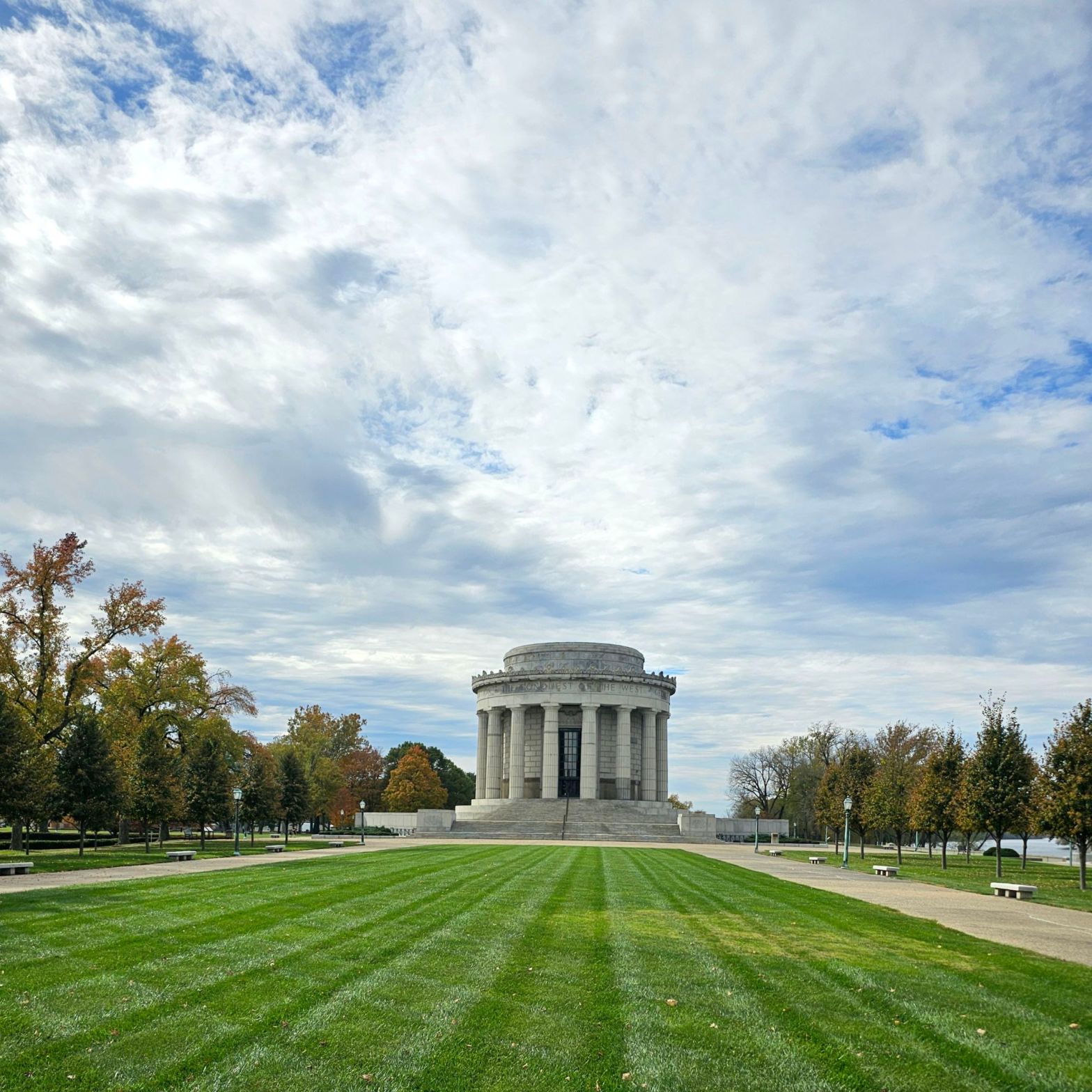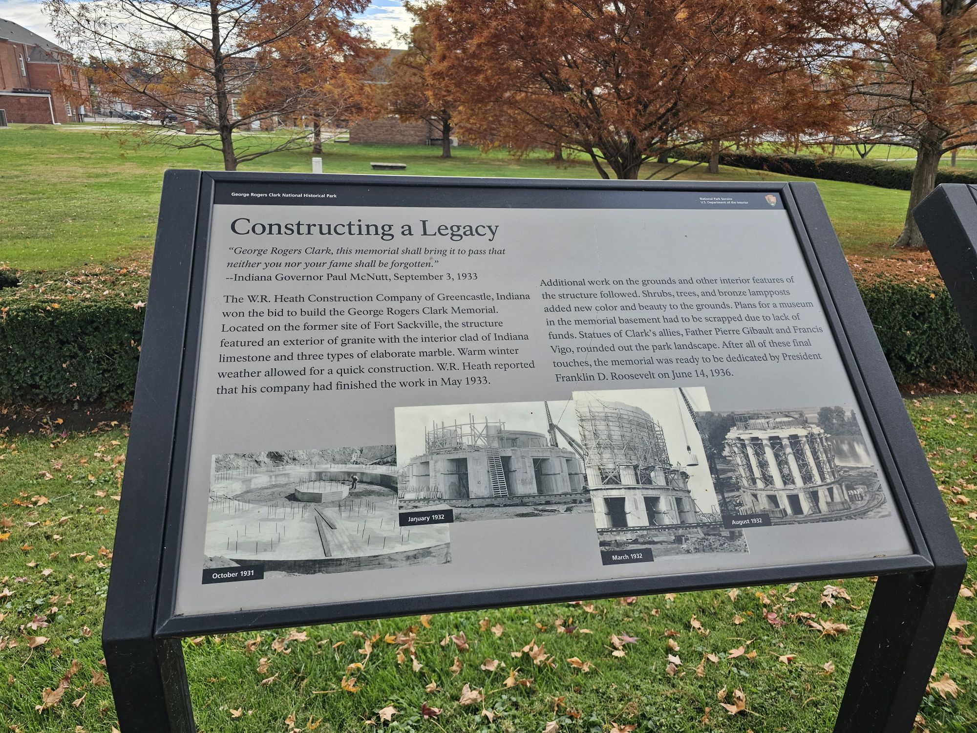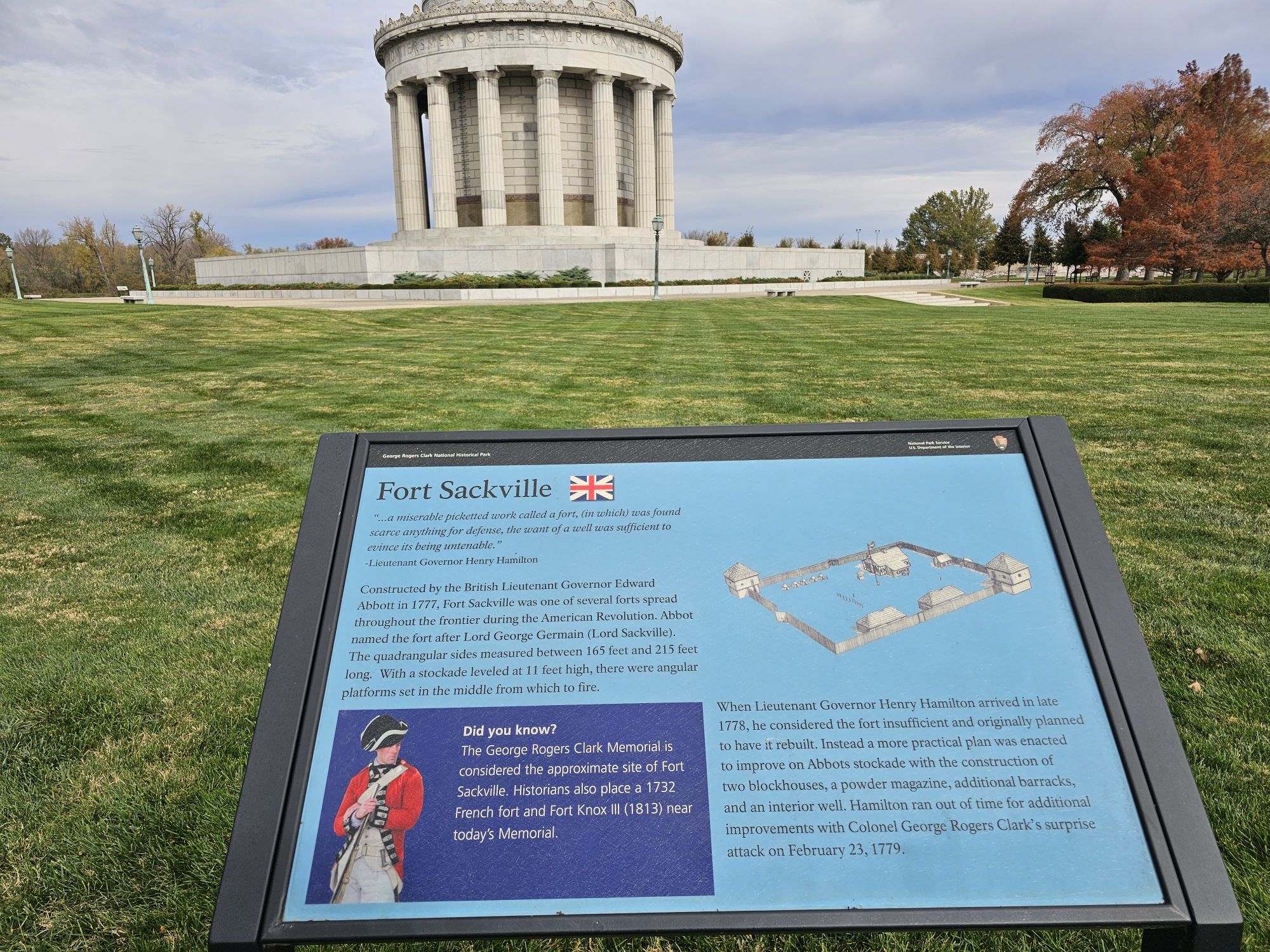George Rogers Clark NHP is probably the very first NPS unit I ever visited. I grew up in Indiana only 45 minutes from this park, and everyone took a field trip there in elementary school! I already have this in my NPS unit count which is why there is no new count at the top. That being the case the last time I was here the internet did not exist, nor did cell phones, digital cameras, or any such sorcery! I found myself in Indiana in the early part of November and took a quick couple hour trip up from Evansville to Vincennes, IN.