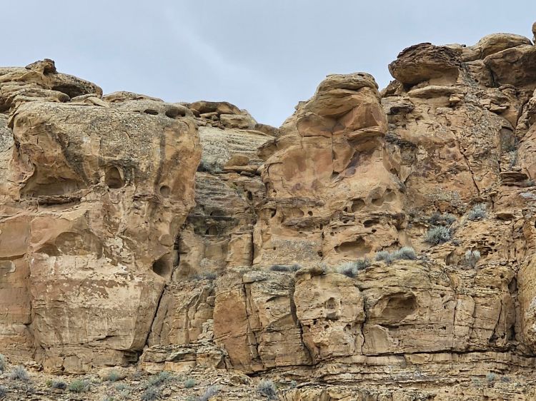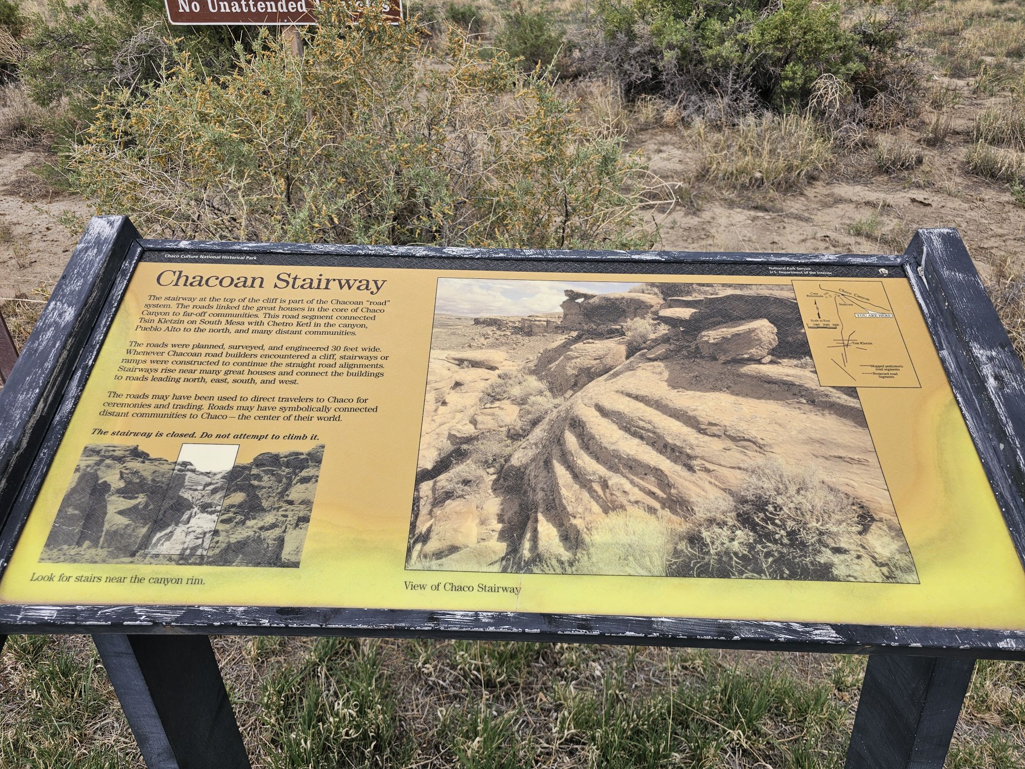 There were other things to do and see but I was concerned about the wind, which at this point was quite strong…and carrying sand, not pleasant, and the clouds coming in. I surely did not want to get caught in any kind of rain on the road getting out of here. But, the last thing I saw and will mention is the ancient Chacoan roads. This entire area was connected though a very functional and extensive road system. In Chaco Culture the roads are not easily seen other than from above, however, at many of the sites the “stairways” can be seen. Essentially these people built very straight roads and did not like curving or going around, so when it came to elevation changes they essentially built stairways down the cliffs to continue the road in a straight fashion! I stopped to check one out as the weather came in and did it in a hurry and got on my way. It was quite difficult to see, but what cool history!