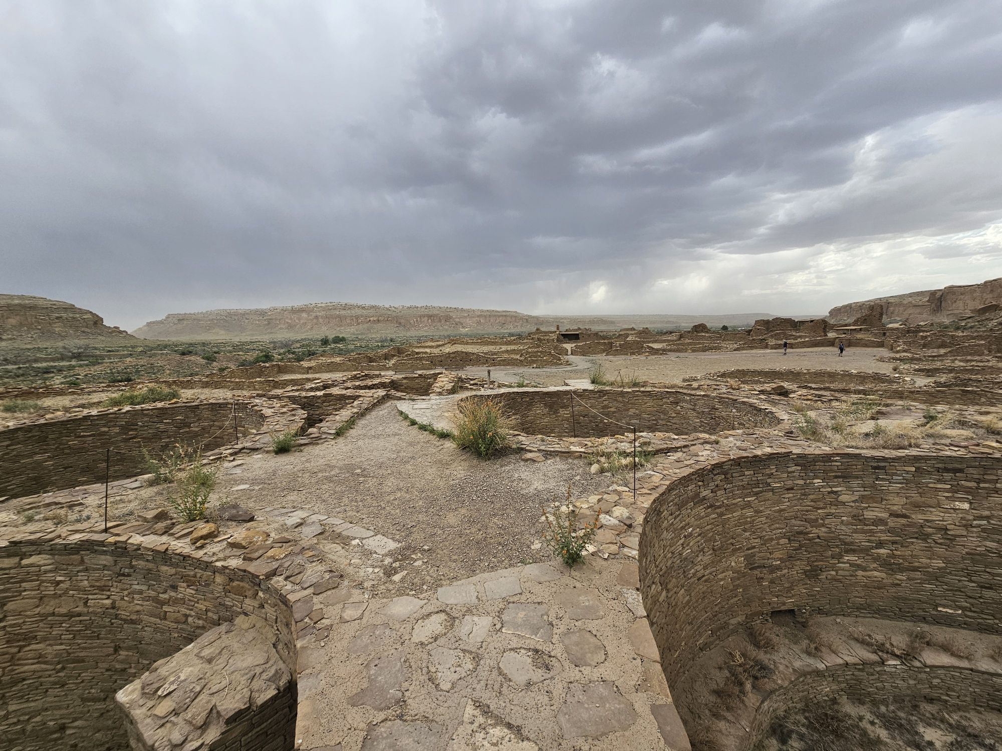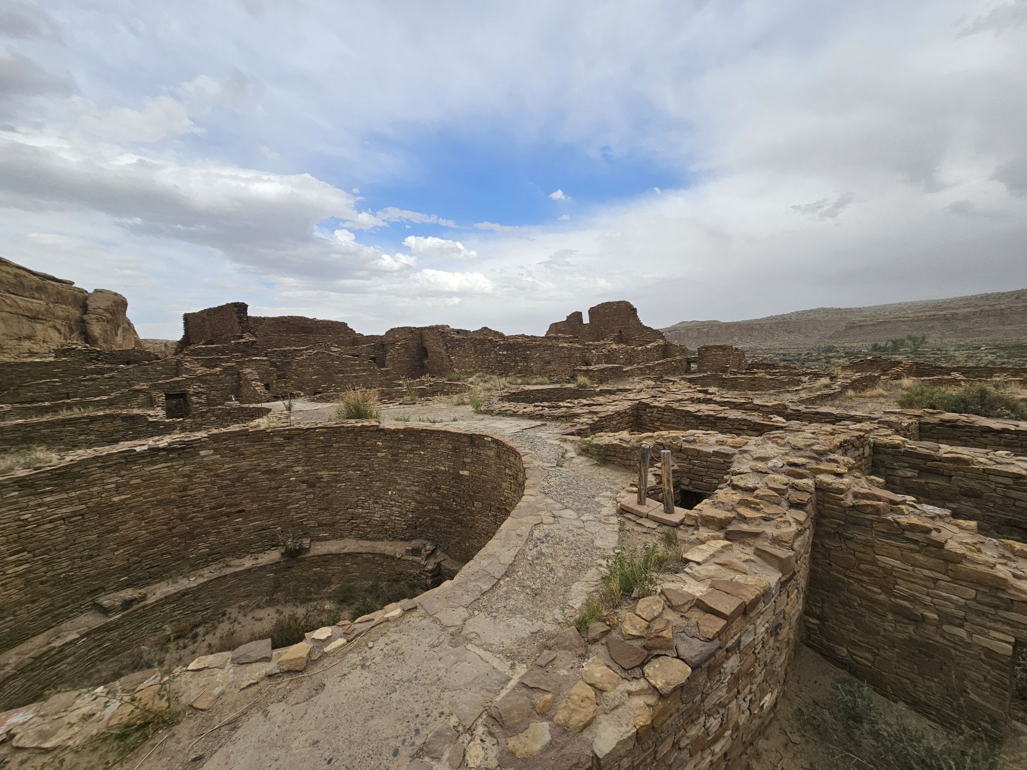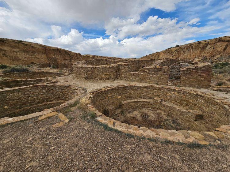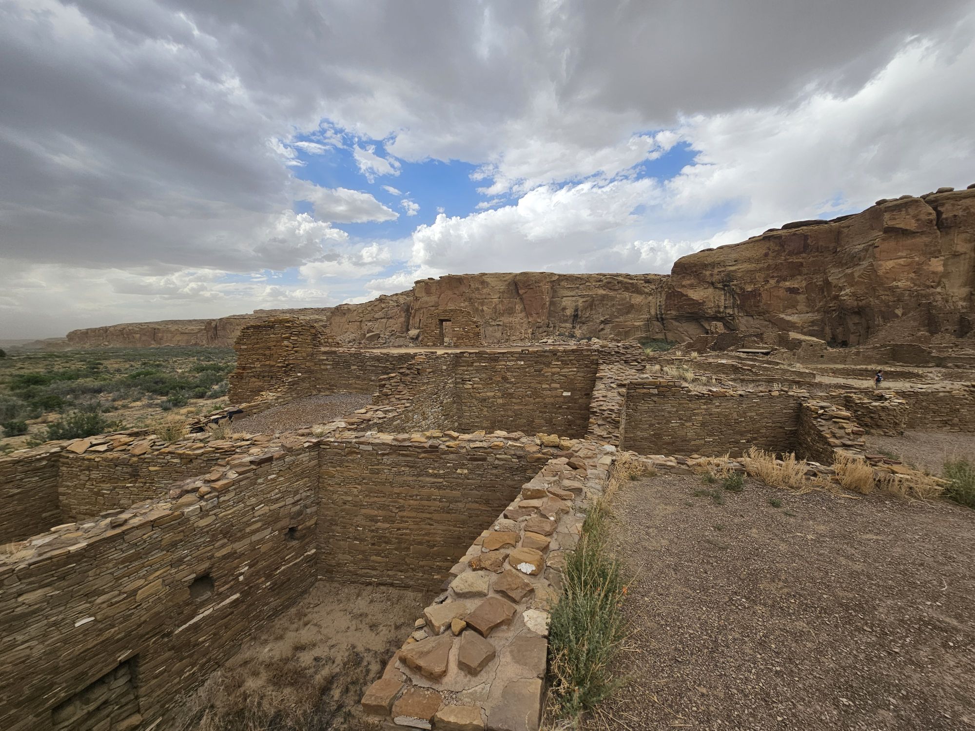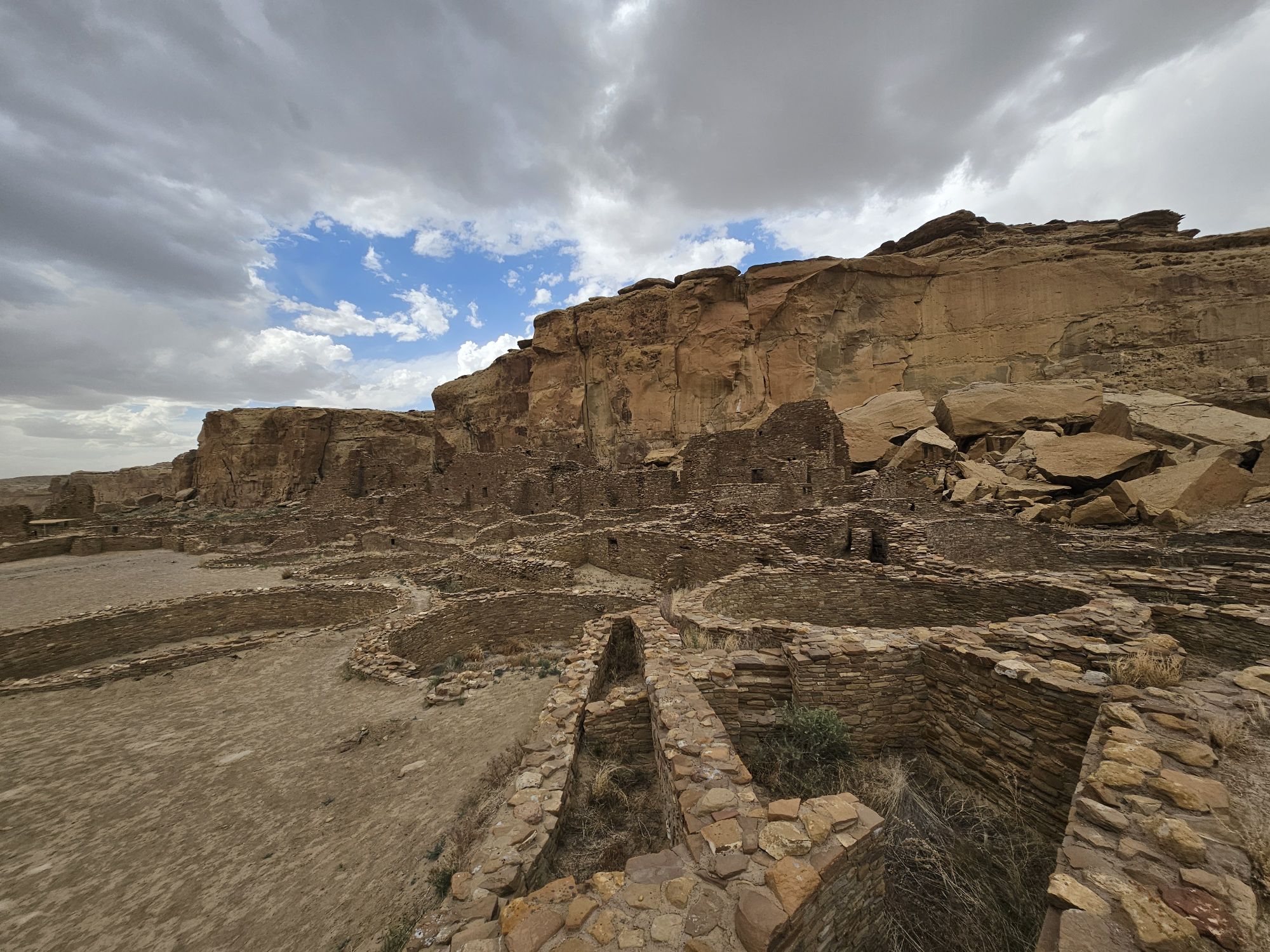 The next stop is Chetro Ketl which is the 2nd largest Great House here and included a 2nd and a 3rd storey. To get to Chetro Ketl one takes a path from the parking lot to the right, and if you go to the left you arrive at Pueblo Bonito. Chetro Ketl was a step up from Hungo Pavi and super impressive. But despite the impressiveness of Hungo Pavi and Chetro Ketl, well, Pueblo Bonito is why people come here. This pueblo is huge. It was the most important site here with 800 rooms. The site was built between 850 and 1150 CE and was the center of the Chacoan world. Cacao from 1200 miles away in Mexico has been found in jars in the site. Unforunately, the weather started to look suspect and the wind really picked up, so I decided to expedite.