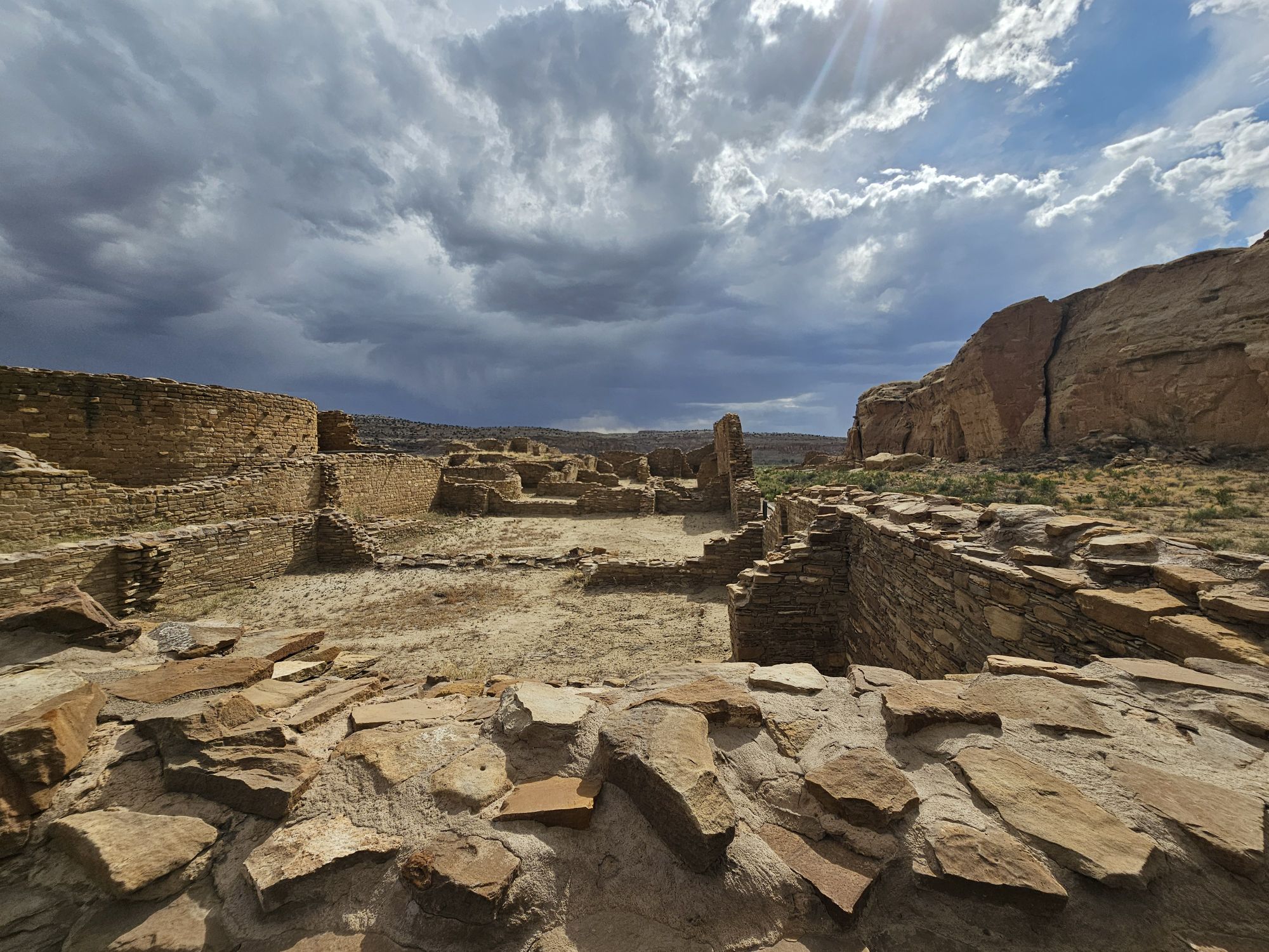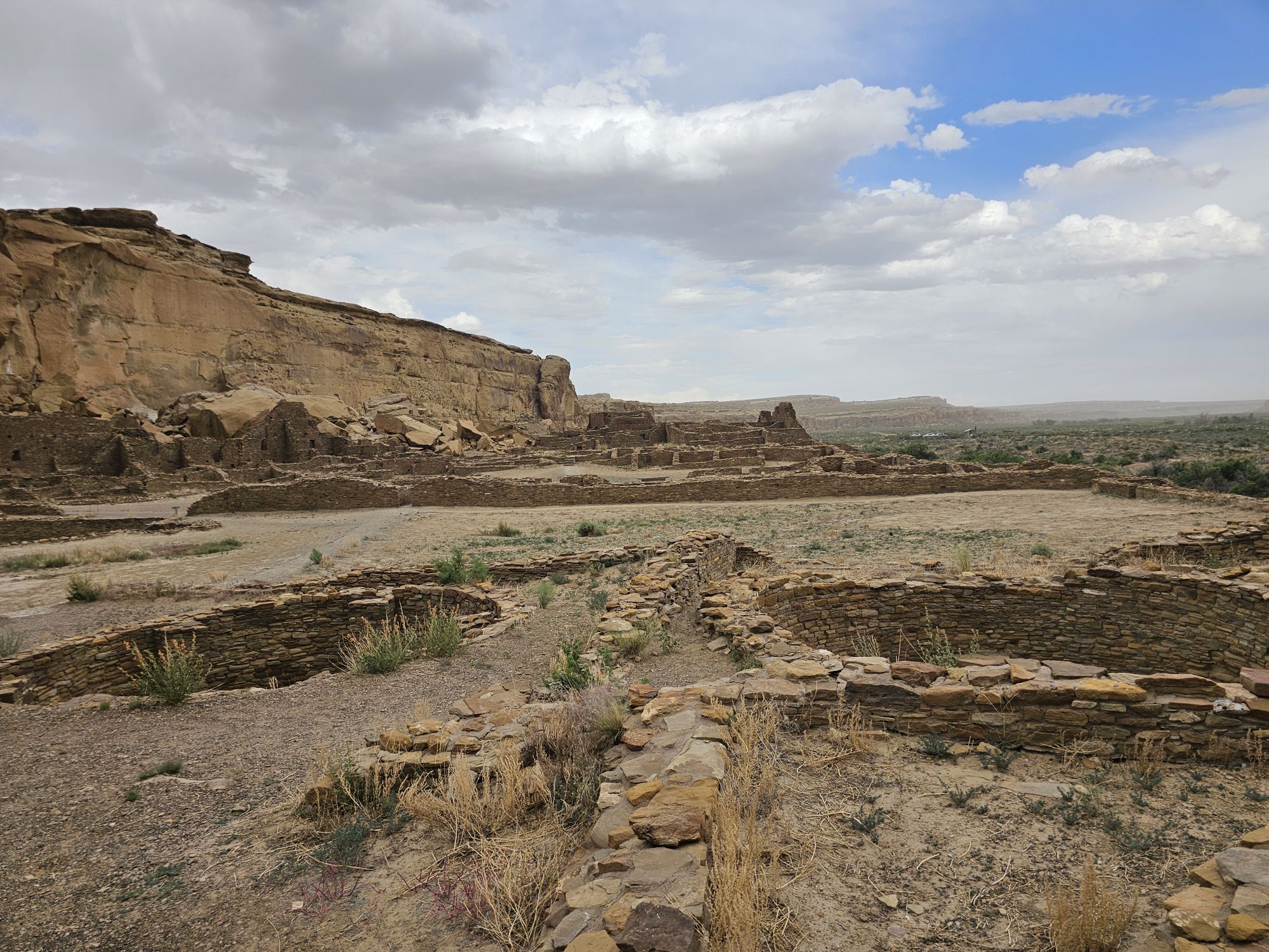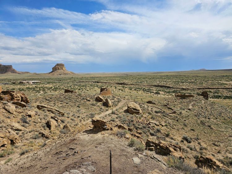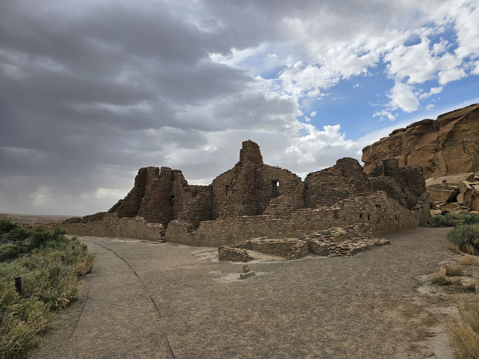 The next stop is Chetro Ketl which is the 2nd largest Great House here and included a 2nd and a 3rd storey. To get to Chetro Ketl one takes a path from the parking lot to the right, and if you go to the left you arrive at Pueblo Bonito. Chetro Ketl was a step up from Hungo Pavi and super impressive. But despite the impressiveness of Hungo Pavi and Chetro Ketl, well, Pueblo Bonito is why people come here. This pueblo is huge. It was the most important site here with 800 rooms. The site was built between 850 and 1150 CE and was the center of the Chacoan world. Cacao from 1200 miles away in Mexico has been found in jars in the site. Unforunately, the weather started to look suspect and the wind really picked up, so I decided to expedite.