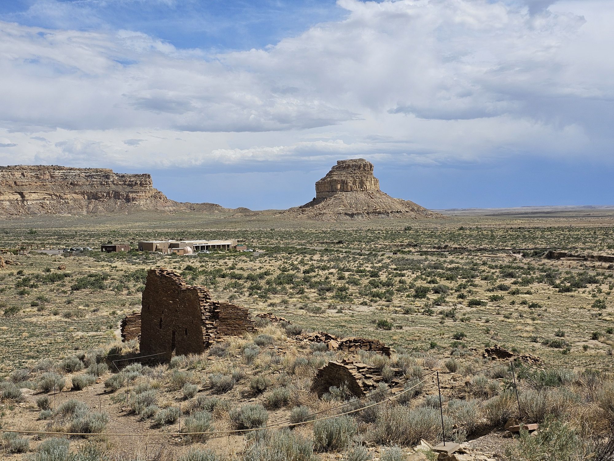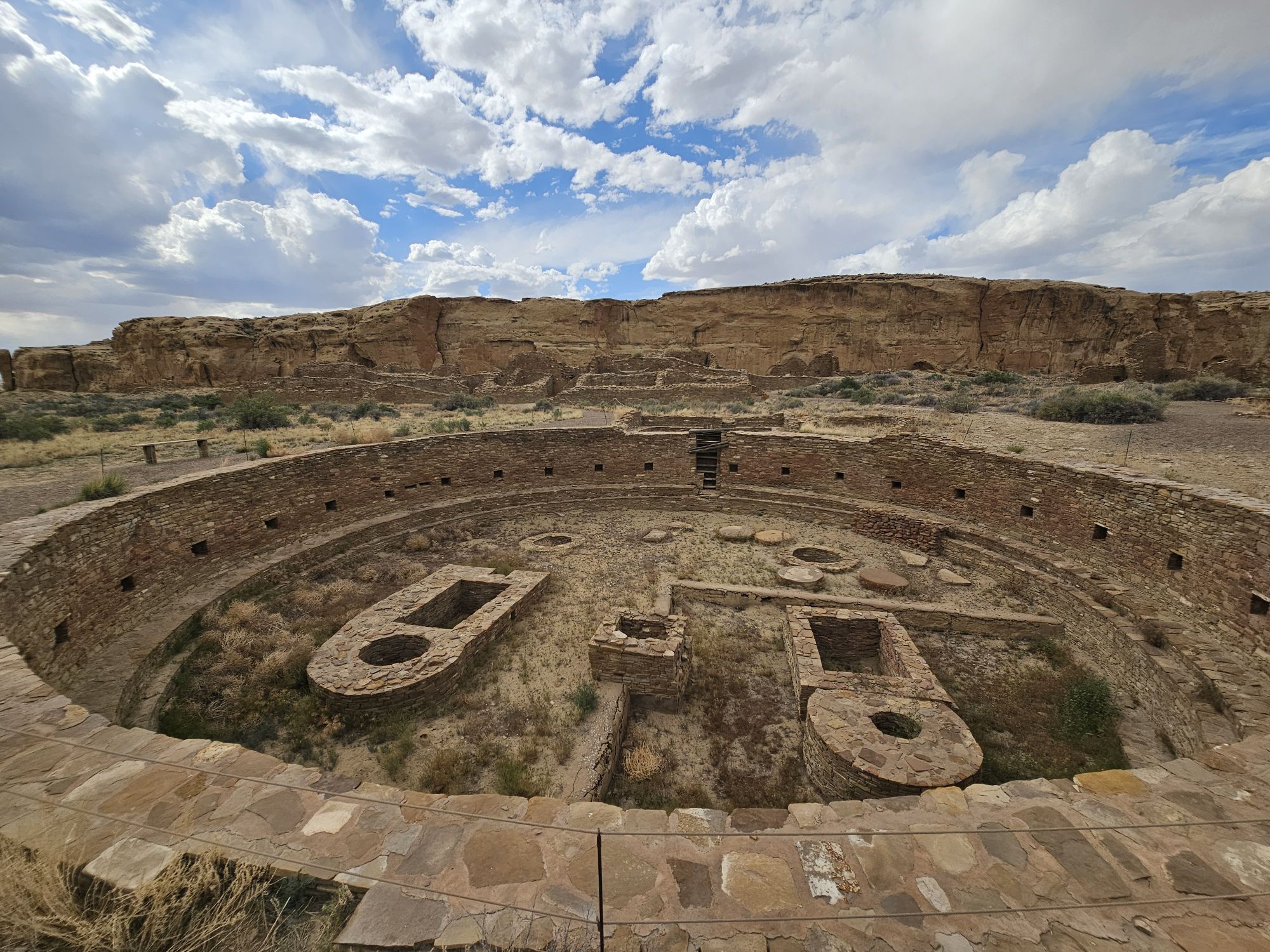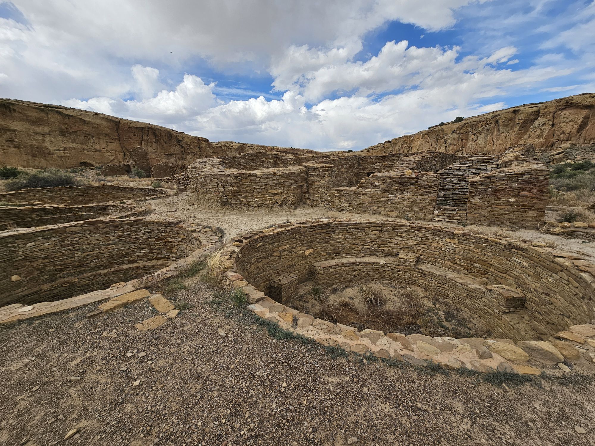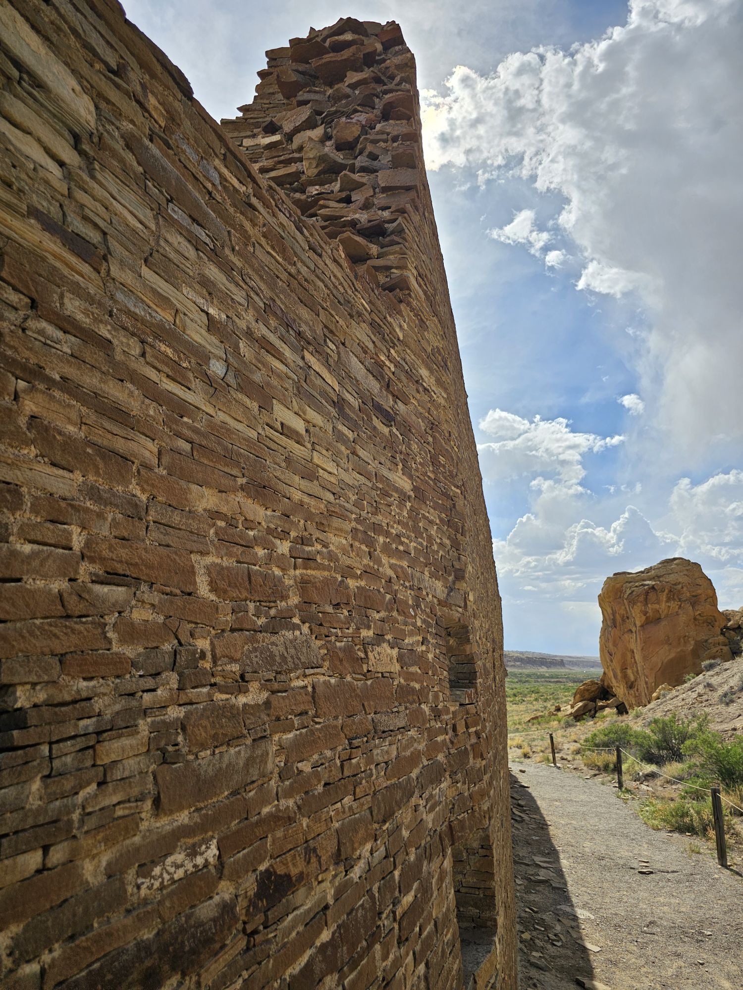 The next stop is Chetro Ketl which is the 2nd largest Great House here and included a 2nd and a 3rd storey. To get to Chetro Ketl one takes a path from the parking lot to the right, and if you go to the left you arrive at Pueblo Bonito. Chetro Ketl was a step up from Hungo Pavi and super impressive. But despite the impressiveness of Hungo Pavi and Chetro Ketl, well, Pueblo Bonito is why people come here. This pueblo is huge. It was the most important site here with 800 rooms. The site was built between 850 and 1150 CE and was the center of the Chacoan world. Cacao from 1200 miles away in Mexico has been found in jars in the site. Unforunately, the weather started to look suspect and the wind really picked up, so I decided to expedite.