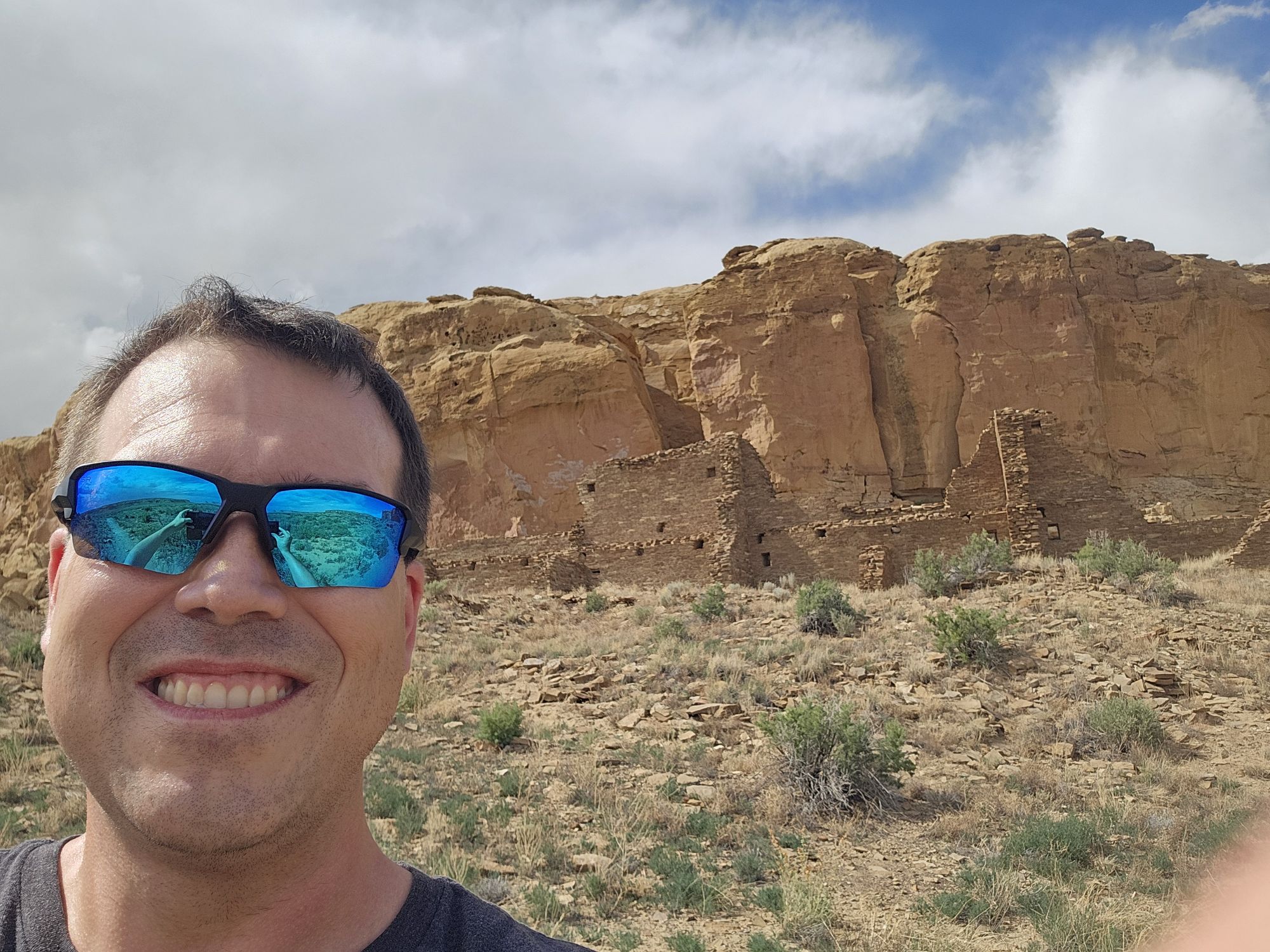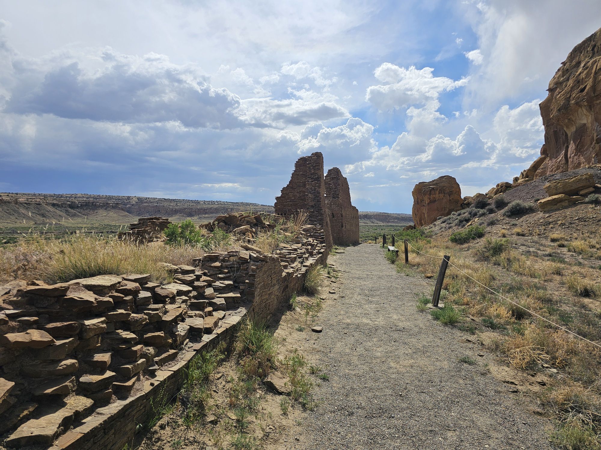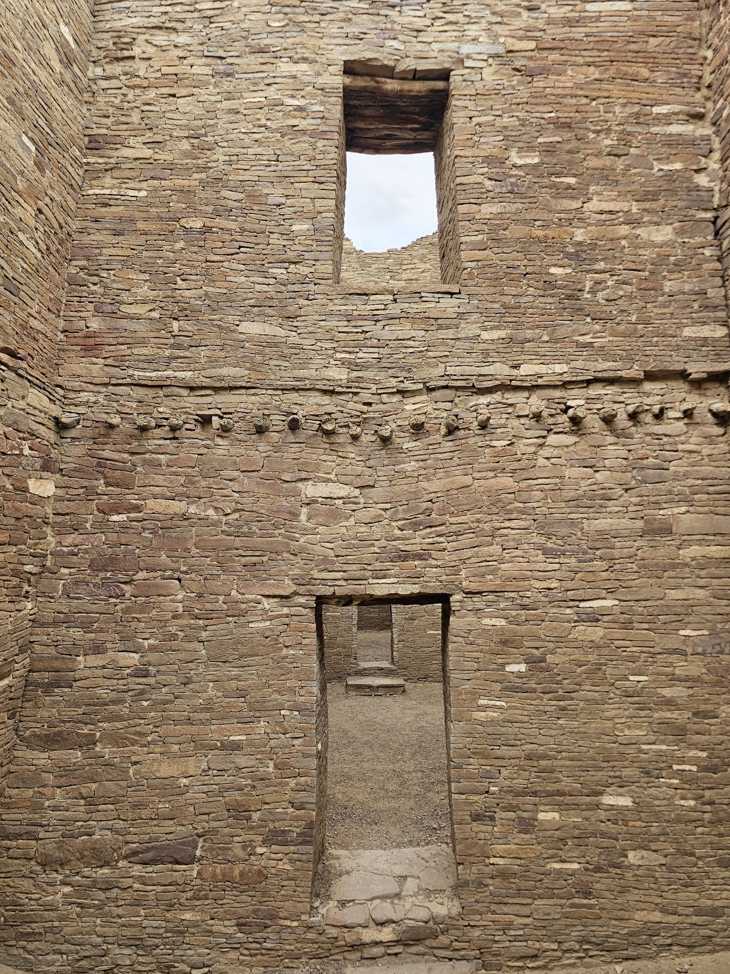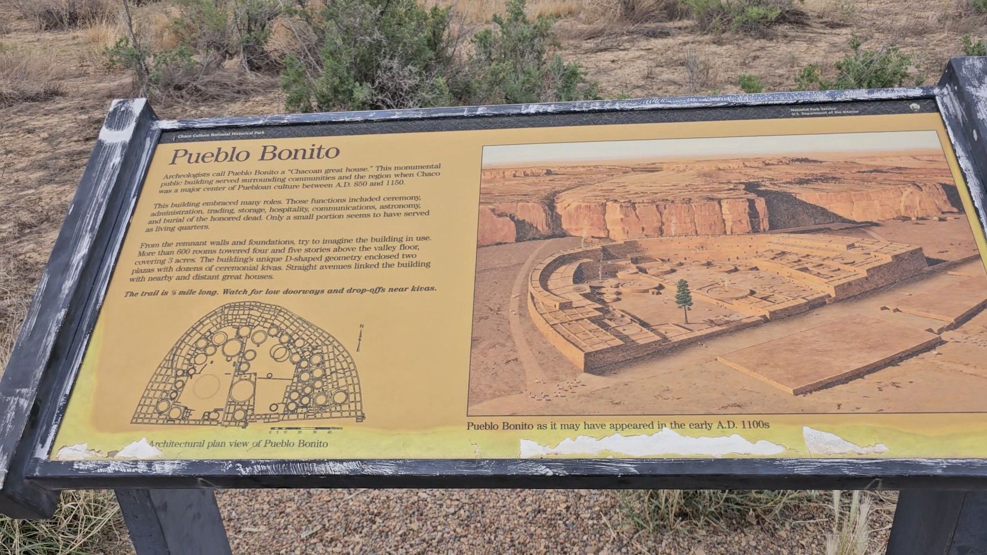 The next stop is Chetro Ketl which is the 2nd largest Great House here and included a 2nd and a 3rd storey. To get to Chetro Ketl one takes a path from the parking lot to the right, and if you go to the left you arrive at Pueblo Bonito. Chetro Ketl was a step up from Hungo Pavi and super impressive. But despite the impressiveness of Hungo Pavi and Chetro Ketl, well, Pueblo Bonito is why people come here. This pueblo is huge. It was the most important site here with 800 rooms. The site was built between 850 and 1150 CE and was the center of the Chacoan world. Cacao from 1200 miles away in Mexico has been found in jars in the site. Unforunately, the weather started to look suspect and the wind really picked up, so I decided to expedite.
