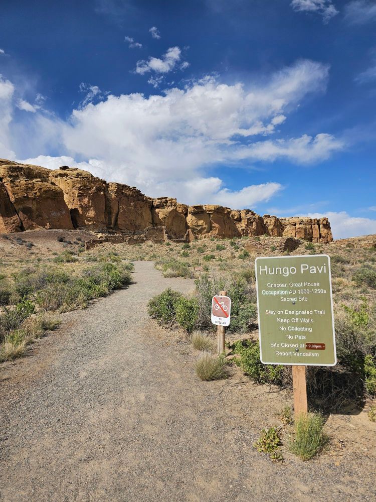 In any event, the surviving ruins here at Chaco are amazing in size and complexity. After checking out the sites near the visitor center I headed further into the park. I was amazed at the extent of the preservation of the sites and the limited work the NPS has had to do to preserve these sites. I was also surprised at how accessible the sites are. You are allowed to walk into the ruins, through the doorways, and if you aren’t watching your step you could fall into the kivas! (don’t do that!) Most of the large sites are along the north side of the loop. The first stop is called Hungo Pavi . This is an unexcavated site that contains a Great House with 150 rooms (yes 150), a great kiva and a plaza. What unexcavated means is that the ruins are still partially covered by wind blown sand and vegetation, which actually protects the site. The policy of not excavating would come up more at Mesa Verde and was surprising to my ignorant self.