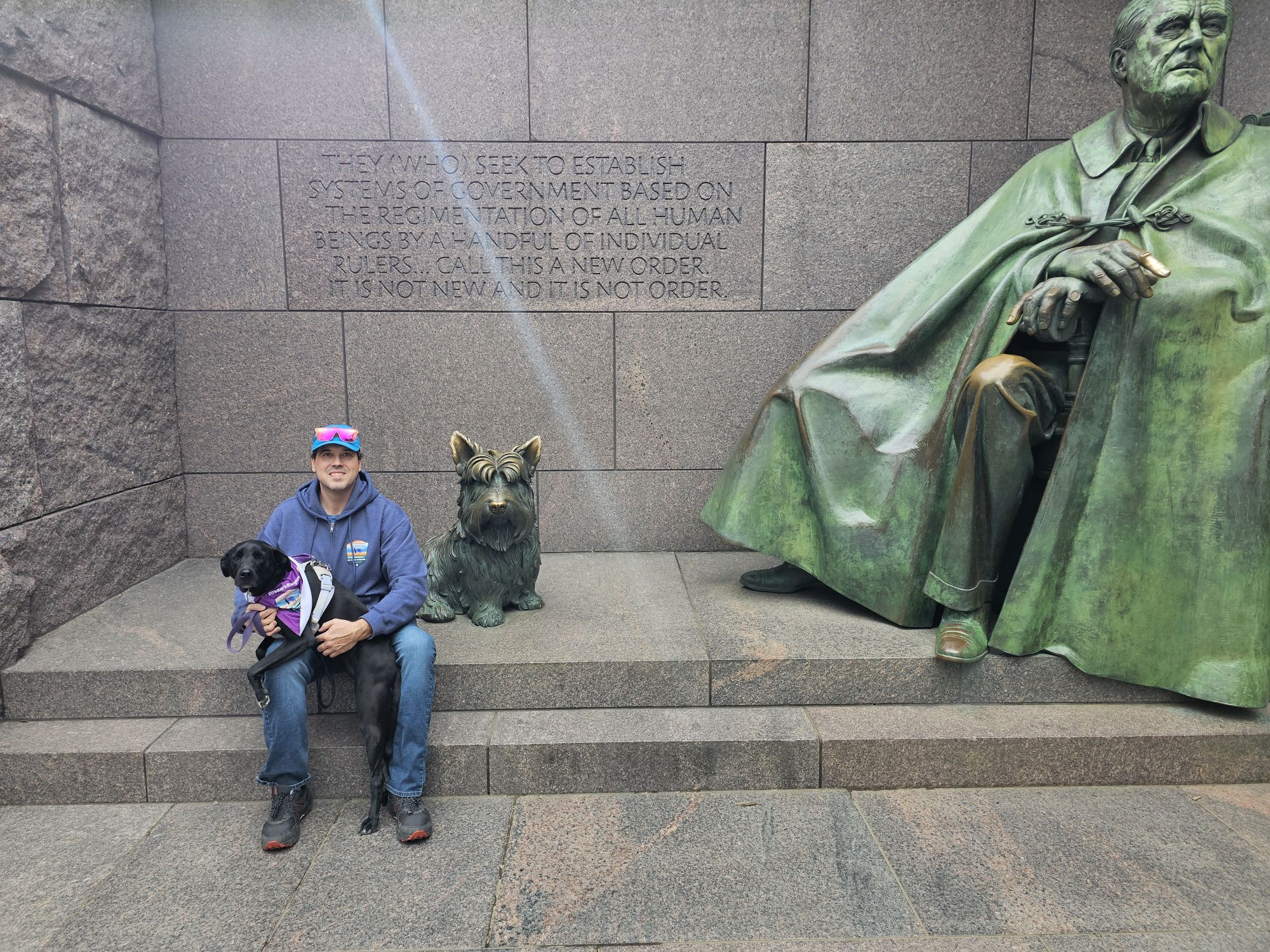 Nicki took this picture…it’s hilarious actually…Maisy never has her ears down like this! But she was NOT having it with FDRs dog, Fala! This is the FDR monument.