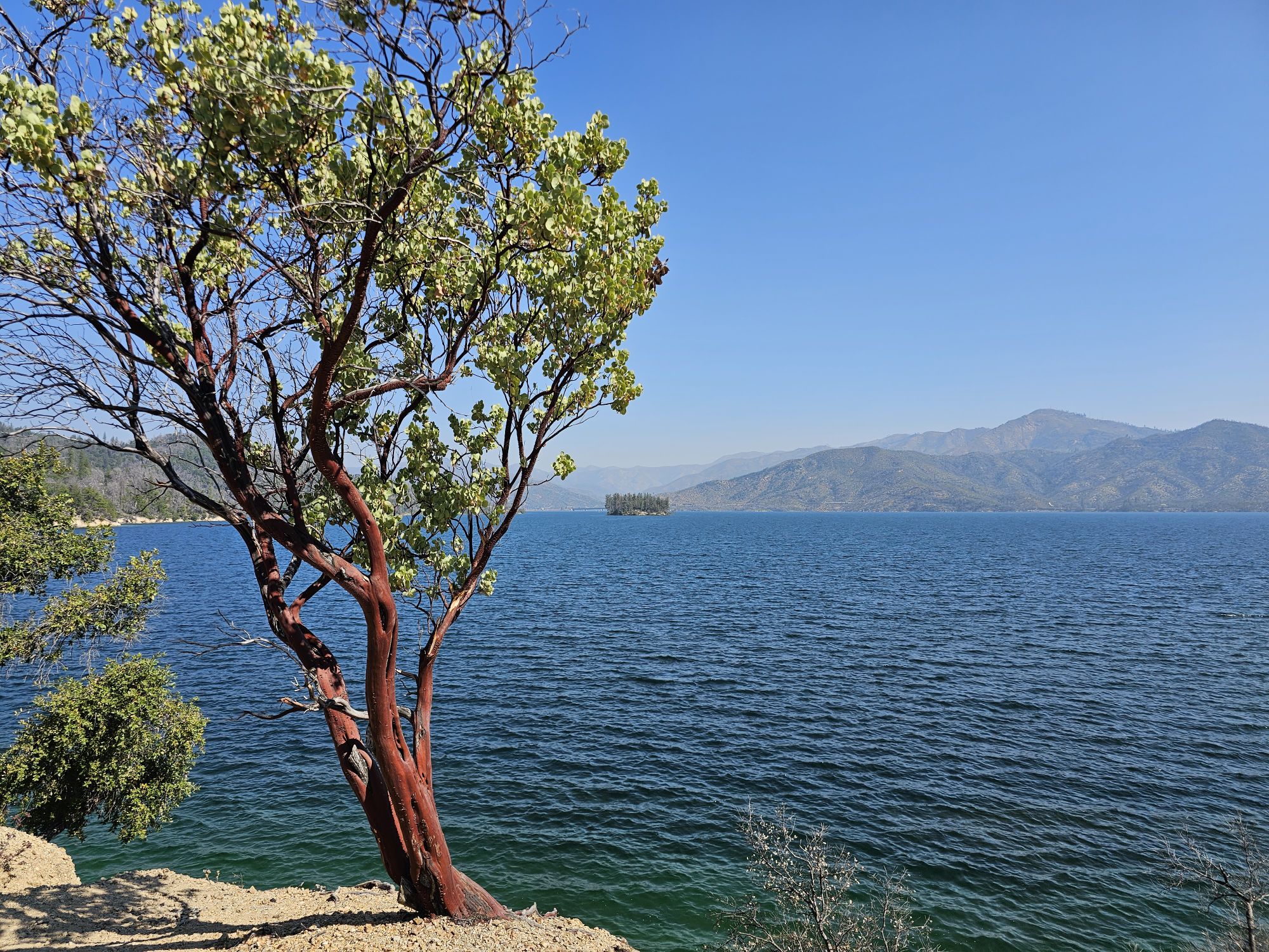 A manzanita shrub on the shore of the lake. Taken by me.