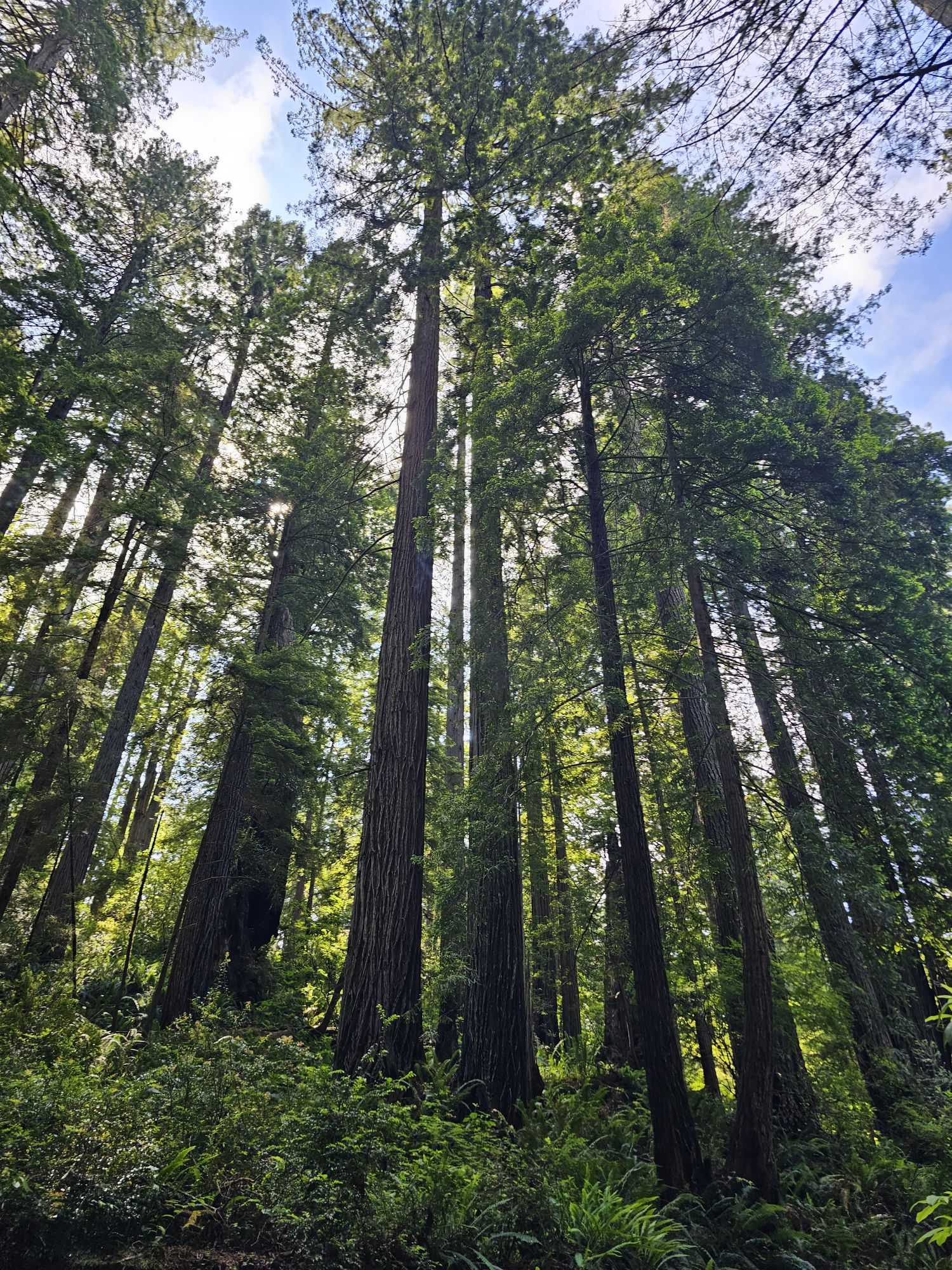 I first stopped at a spot called Big Tree, a very apt name! The tree is accessed by a very short trail that is very accessible and close to a parking lot with a restroom, and the first place you get to see the redwoods up close. If you want to extend the trial, you can. Most of the trails throughout the section of the park off of this road connect. Now a brief comparison and contrast to sequoias. First of all the two trees are very closely related. Sequoias are larger by volume. Redwoods are taller and more slender. Oddly enough redwood bark is more brown colored while sequoia bark is more red colored. Go figure. Sequoias grow more spread out and at high elevation, while redwoods are clustered in a continuous belt of nearly 450 miles long but only 15 miles wide, along the Pacific coast. Both trees have exceptionally small cones, like hilariously small for their size, but the redwood is tiny, about a third the size of a sequoia cone. Redwood trees have the ability to basically create clones of themselves from roots, cut stumps, and even from branches up high. Big Tree actually has one such close growing downward from way up high. I spoke to a park ranger in the area for a while about the trees and the differences between the two. This ranger also threw a bit of shade at Sequoia National Park, which was amusing. I mentioned casually about how they find the tallest trees like Hyperion (this is the tallest known tree in the world at nearly 400 feet but its location in Redwood National park is guarded to protect it). This particular ranger was a bit coy but also mentioned that they do not name trees like “other parks” do because they are trees and don’t need names! Anyway, Big Tree (Which is a name, I might add!) is 286 feet tall, 24 feet around as an average, 74.5 feet around at the base, and is 1500 years old! The other thing I noticed about the redwood area is that these trees are everywhere! In sequoia they were spaced out and only in certain areas, but here the redwoods are everywhere!