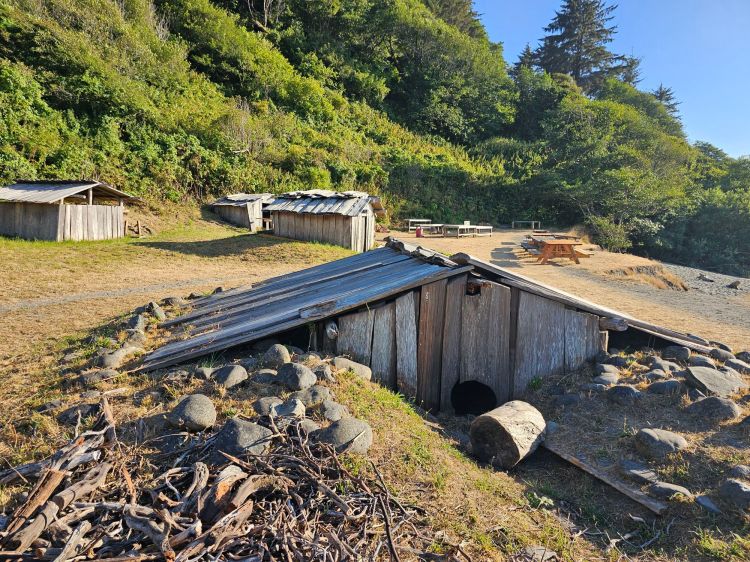 Some of the Yurok structures on Klamath Beach.