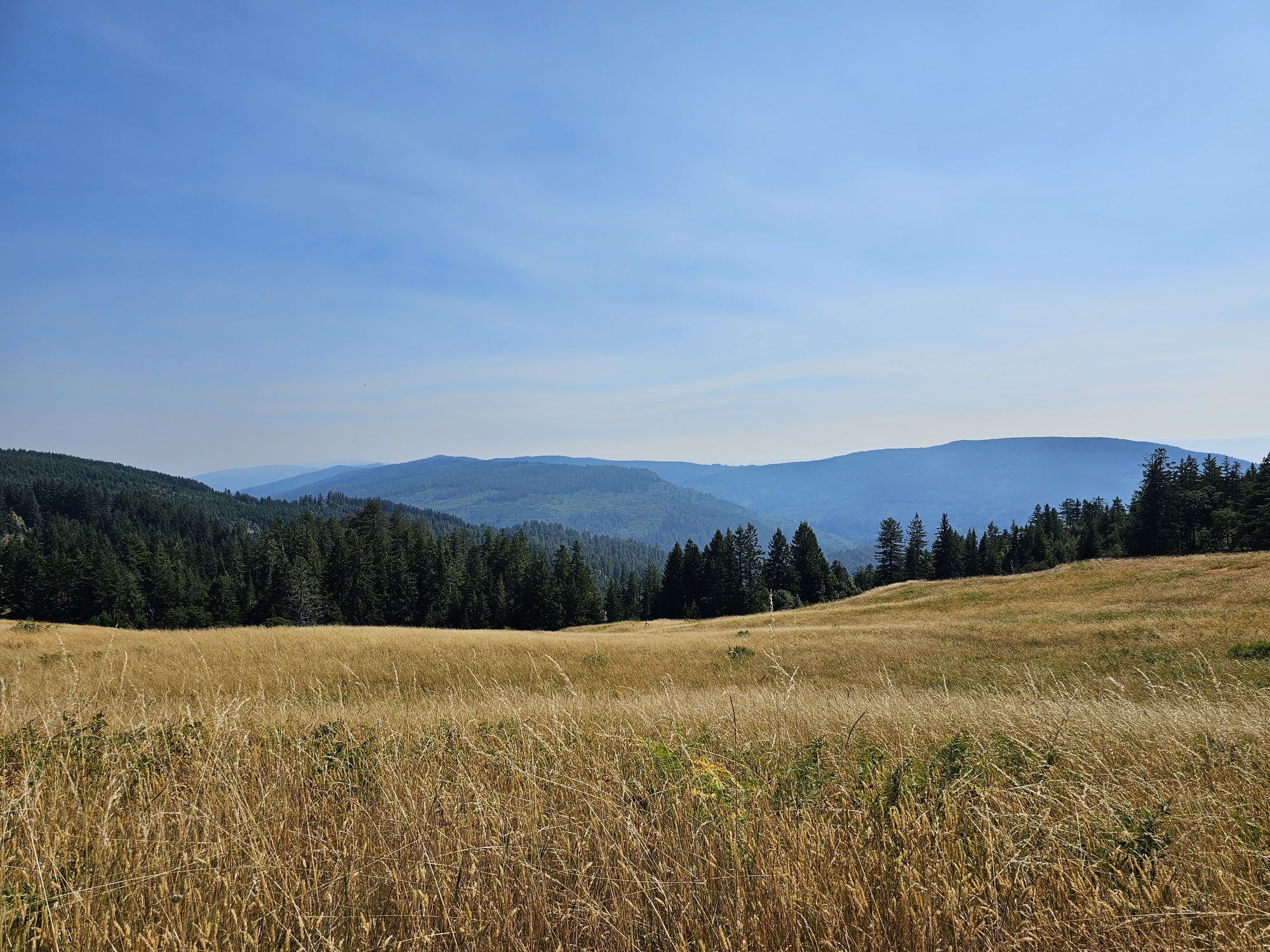 Next I headed all the way down to the south end of the park. After stopping by that first visitor center I missed the previous day I took a drive up Bald Hills road, an active logging road. The first stop on this road is the Lady Bird Johnson Grove. The one time first lady had a big interest in protecting the environment and her husband dedicated this grove to her when he was President. The grove here is actually quite a bit higher in elevation and is not the optimal environment for the redwoods. They are smaller and share space with a lot of different trees and shrubs. Continuing on a way up the road was my turn around spot, though one can certainly go on, where the road turns to gravel as you come up to an new section of the park, one of higher elevation, a lot more heat, and a very prairie-esque look. How bizarre! I had already run unexpectedly into cool beaches and whales, and now here we have section with a distinctly plains feel. Very surprising! Anyway, where I turned around was the trailhead for the historical Lyons Ranch which was in operation from the mid 1800s to mid 1900s. The trail is 4 miles round trip so I decided to not pursue the ranch.