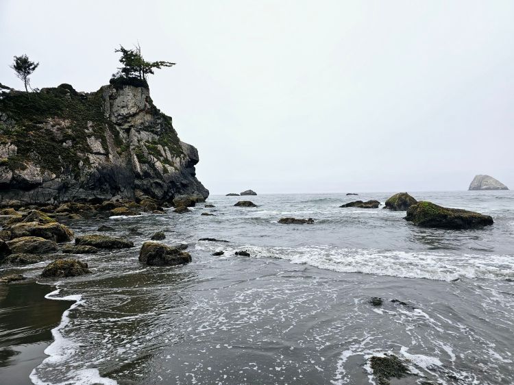 Upon returning to Klamath I discovered another really cool tourist spot, the Tour Through Tree! So, this makes two trees that I drove through this summer! This one cost me 5 bucks, but was worth it! This tree is alive and still standing, and the hole to drive through, was very tight. I had a medium size car and I had to put the mirrors in to make it! So of course I did it a couple times and had a blast doing it (video to come later!). Afterward I did one last trail, one that started at the Trees of Mystery place and went down to the shore of a secluded hidden beach. The trail starts basically on the side of the highway and is easy to miss. It also goes through some very thick vegetation and at times seemed a little suspect. I came across no one on the trail and the beach was pretty empty, just me and two others. It was definitely a beautiful spot, but it was foggy again, so I took in the grey and overcast beauty, rather than a sunny one.