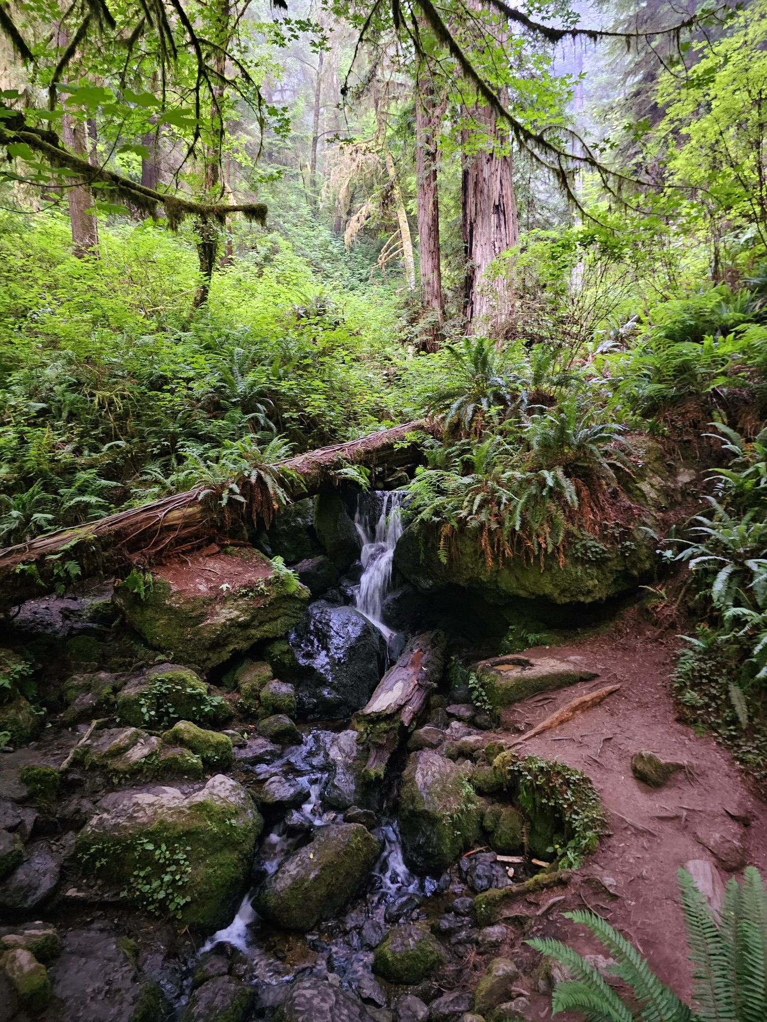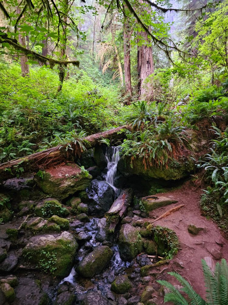 The following morning was my departure from Redwood, but I had one more stop. At this point I should point out that there is one very huge draw in the park. I am slightly embarrassed to say that I was not aware of it ahead of time. The spot in question is called Fern Canyon. It is very popular and in fact so popular that one is not even allowed to drive to it without an online reservation. Of course, I did not have one. I hoped that getting up very early I would be able to get down to that spot and do a really quick in and out (the canyon itself is not very long) before the rangers showed up. I got about half way down the narrow, gravel road, which took me nearly 30 minutes and then I knew there was a creek crossing coming up. Being that I was in a rental car, and the time required to finish the drive and then drive back was longer than I was comfortable with, I decided to turn around. I had a back up though! The road to Fern Canyon provides access to a trail to Trillium Falls. The trail was fairly easy and took about 45 minutes. The waterfall in question…well, lets just say it is very pretty, but is actually pretty underwhelming from a size perspective. In fact, I almost thought this was not it and I needed to go further, but no, that was it. Pretty to be sure! But not jaw dropping. And with that, this National Park was done!